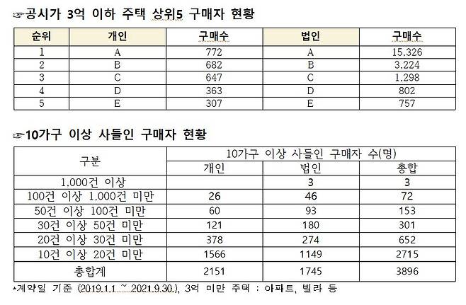 또 2019년 1월부터 지난 9월말까지 공시가격 3억원 미만 주택 10가구 이상을 사들인 구매자수를 분석한 결과 개인 법인을 합쳐 총 3896명이었다. 개인의 경우 1인이 최대 772가구를 사들인 사례도 확인됐다. 법인은 최고 1만5326가구 매수했다. 3224가구, 1298가구를 싹쓸이한 법인도 등장했다. 100가구 이상 1000가구 미만 쇼핑한 개인이 26명, 법인이 46곳에 달했다.