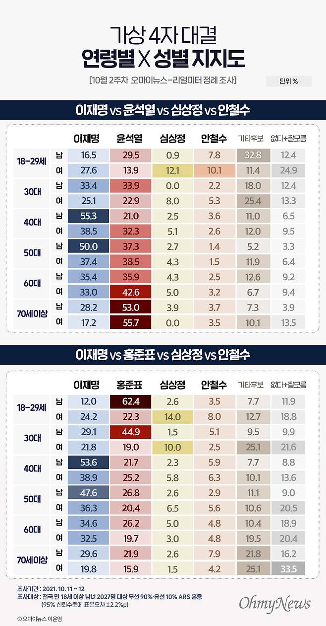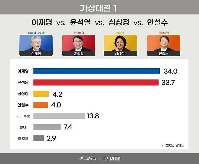 이재명-윤석열-심상정-안철수 4자 가상대결 결과, 이재명 민주당 후보 34.0%, 윤석열 국민의힘 경선후보 33.7%로 나타났다. 두 후보의 격차는 0.3%p로 오차범위 내 초접전이다. 이어 심상정 정의당 후보 4.2%, 안철수 국민의당 대표 4.0%, '기타 후보' 13.8%로 나타났다. 부동층(없다 7.4% + 잘 모름 2.9%)은 10.3%였다.