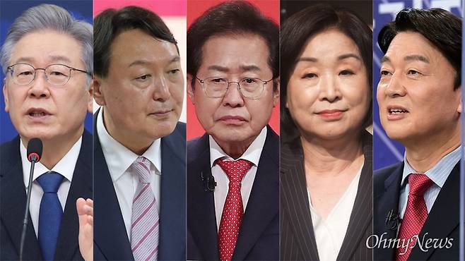 | ▲ 왼쪽부터 이재명 더불어민주당 대선후보, 윤석열 국민의힘 대선경선 후보, 홍준표 국민의힘 대선경선 후보, 심상정 정의당 대선후보, 안철수 국민의당 대표. |