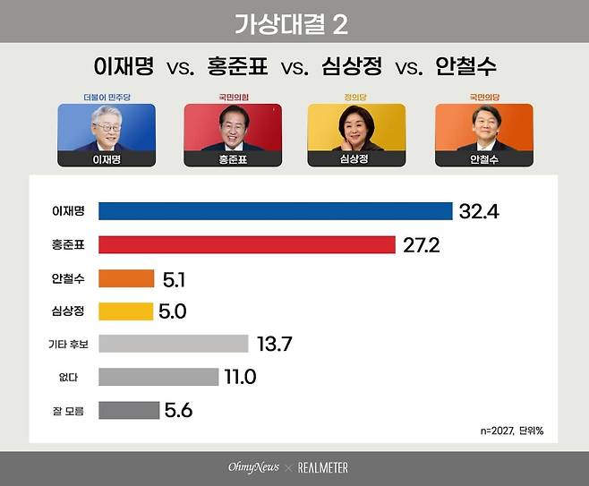 윤석열 대신 홍준표 국민의힘 경선후보를 상정한 이재명-홍준표-심상정-안철수 4자 가상대결에서는 이재명 32.4%, 홍준표 27.2%로 이재명이 오차범위를 벗어난 5.2%p 차이로 앞서는 것으로 나타났다. 이어 안철수 5.1%, 심상정 5.0%, '기타 후보' 13.7%로 조사됐다. 부동층(없다 11.0% + 잘 모름 5.6%)은 16.6%였다.