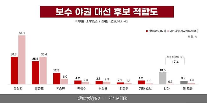 '보수 야권의 대선 후보로 누가 가장 적합하다고 생각하는가'를 묻고 6명의 선택지를 제시한 결과, 윤석열 국민의힘 대선경선 후보(전 검찰총장)가 30.3%, 홍준표 국민의힘 대선경선 후보(국회의원)가 25.5%로 나타났다. 둘의 격차는 4.8%p로 오차범위(95% 신뢰수준에 ±2.2%p)를 벗어난 윤석열 우세다. (이하 호칭은 첫 번째 표기 후 생략)