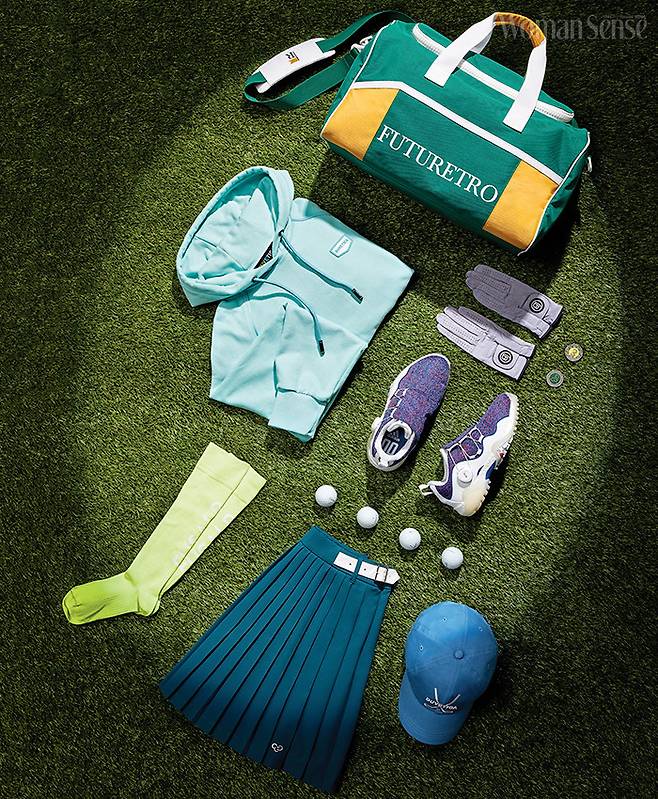 로고 포인트 컬러 블록 보스턴백 35만9천원 퓨처레트로. 캐주얼 룩으로도 활용 가능한 후드 스웨트셔츠 42만원 듀베티카. 파스텔 퍼플 골프 글러브 6만9천원 벤제프. 앤티크한 메탈에 옐로&그린을 더한 볼 마커 세트 16만7천원 맥케이슨. 멜란지 컬러 메시 니트 골프화 22만원 아디다스골프. 레터링 프린트 네온 그린 니삭스 7만6천원 퓨잡. 딥 그린 플리츠스커트 45만6천원 맥케이슨. 로고 자수로 경쾌함을 더한 스카이블루 볼캡 13만원 듀베티카.