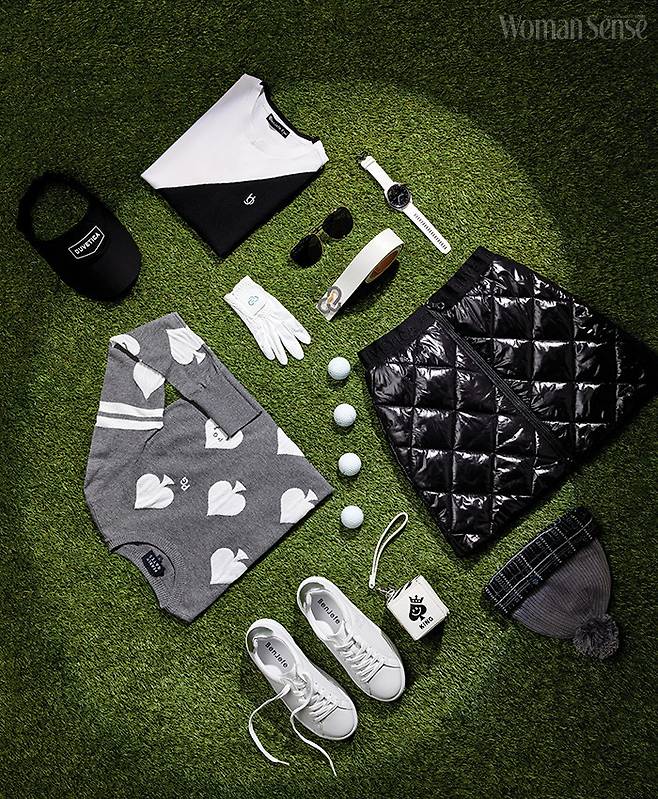 화이트 로고 포인트 블랙 선바이저 15만원 듀베티카. 블랙&화이트 배색 니트 베스트 11만9천원 벤제프. 스페이스 패턴 그레이 니트 풀오버 37만8천원 파리게이츠. 화이트 골프 글러브 가격미정 맥케이슨. 블랙 보잉 선글라스 42만9천원 빅터앤롤프 by 시원아이웨어. 화이트 GPS 골프 워치 62만9천원 가민. 메탈 장식이 돋보이는 화이트 레더 벨트 45만6천원 맥케이슨. 집업 디테일 블랙 미니 퀼로트 59만원 듀베티카. 라운드 토 디자인의 화이트 골프화 23만8천원 벤제프. 프린트로 위트를 더한 큐브 볼 케이스 9만8천원 파리게이츠. 체크 패턴이 트리밍된 그레이 폼폼 비니 3만3천원 아디다스골프.