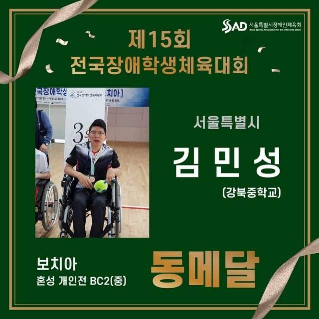 서울시립뇌성마비복지관(관장 류영수, 이하 복지관) 김민성(강북중학교 2학년)은 지난 9월 27~30일 포항종합체육관에서 진행된 제15회 전국장애학생체육대회 보치아 종목에 서울시 대표로 출전go 혼성 개인전 BC2 동메달을 획득했다고 14일 밝혔다.