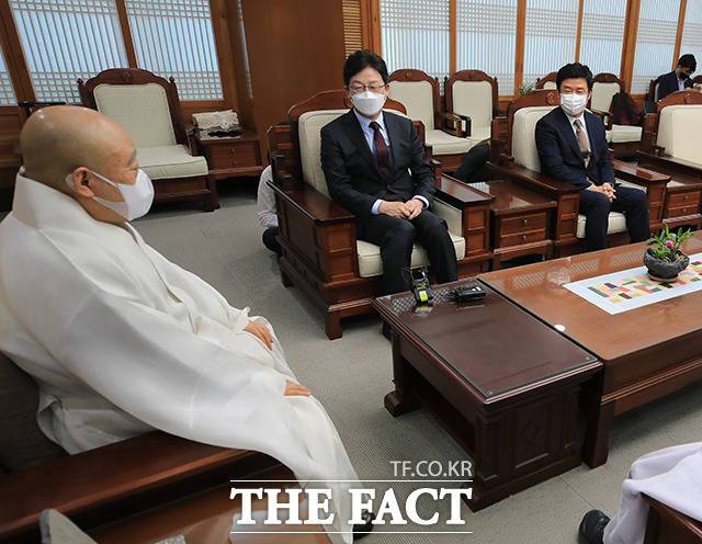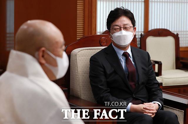 [더팩트ㅣ국회사진취재단] 국민의힘 대권 주자인 유승민 전 의원이 14일 오전 서울 종로구 조계사불교역사문화기념관에서 조계종 총무원장 원행스님을 예방하고 있다.
