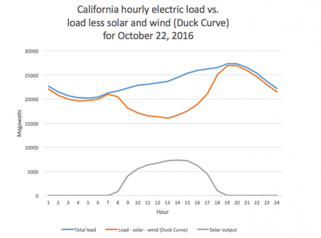자연에서 에너지를 얻는 방법이 최상이지만 문제는 이 에너지가 간헐적 소스라는 것이다. 바람과 햇볕에 에너지를 의존하니 구름이 끼거나 바람이 불지 않으면 기존의 발전 방법으로 즉시 보충해 주어야 한다. 미국 캘리포니아는 오후에 해가 진 후 태양광 발전이 멈추는 오후 5시경 갑작스럽게 필요한 화력발전 전력 부하가 문제가 된다. 이런 것을 전력수요 그래프가 오리 모양을 닮았다 해서 '덕커브'(아래 그림 참조) 라고 한다.
