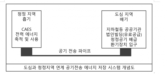 필자가 제안하는 '도심청정형 공기압축 에너지 저장 전송방식'은 위 하이브리드형 공기압축 에너지 저장방식에 공기전송 파이프를 사용해 청정 공기를 도심으로 전송하는 방법을 부가한 것이다. 서울시청과 북한산 국립공원은 직선거리로 2km 정도 된다. 필자가 제안한 방법을 사용하면 북한산 공기를 압축해 발전을 할 수 있을 뿐 아니라 북한산의 맑은 공기를 서울시청 지하철과 지하 상가에도 공급할 수 있다.