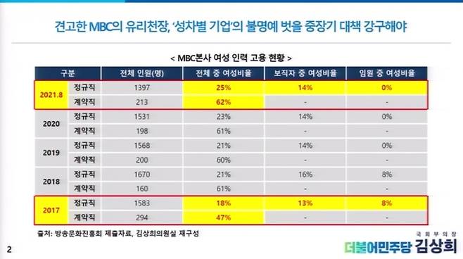 한편 김상희 의원은 MBC의 성차별 고용 실태 역시 심각하다고 지적했다. 김 의원은 “지난해 국가인권위원회가 대전MBC 아나운서 문제 건으로 MBC에 전체 성차별 고용 실태조사를 하고 대책을 마련하라고 권고했는데 하지 않았다”면서 “이게 얼마나 심각하냐면 여성 보직자 비율이 2017년 13%였던 게 4년이 지난 지금도 1%p밖에 안 늘었다. 게다가 임원 중 여성 비율은 0%다. 민간기업만도 못하다”고 비판했다.