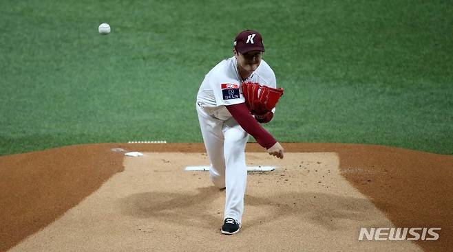 [서울=뉴시스] 김선웅 기자 = 14일 오후 서울 구로구 고척스카이돔에서 열린 2021 프로야구 NC 다이노스와 키움 히어로즈의 경기, 1회초 키움 선발투수 최원태가 역투하고 있다. 2021.10.14. mangusta@newsis.com