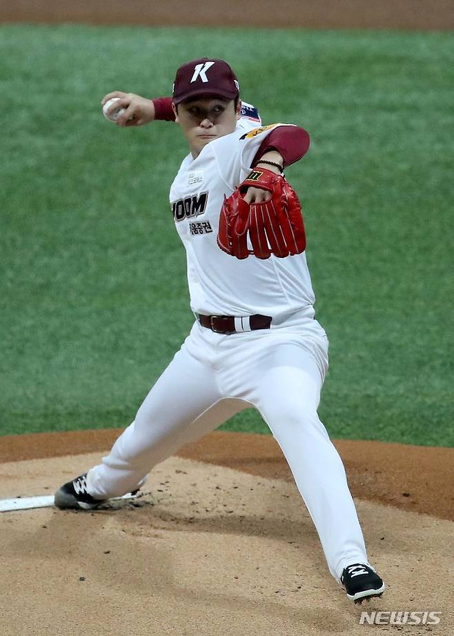 [서울=뉴시스] 김선웅 기자 = 14일 오후 서울 구로구 고척스카이돔에서 열린 2021 프로야구 NC 다이노스와 키움 히어로즈의 경기, 1회초 키움 선발투수 최원태가 역투하고 있다. 2021.10.14. mangusta@newsis.com