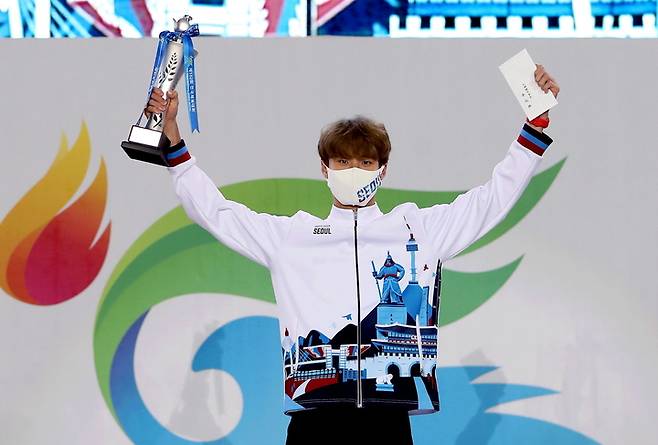 [서울=뉴시스] 배훈식 기자 = 제102회 전국체육대회가 폐막한 14일 오후 경북 구미시 구미시민운동장에서 열린 폐회식에 참석한 수영 황선우가 MVP 트로피를 들고 기념촬영을 하고 있다. (사진=대한체육회 제공) 2021.10.14. photo@newsis.com *재판매 및 DB 금지