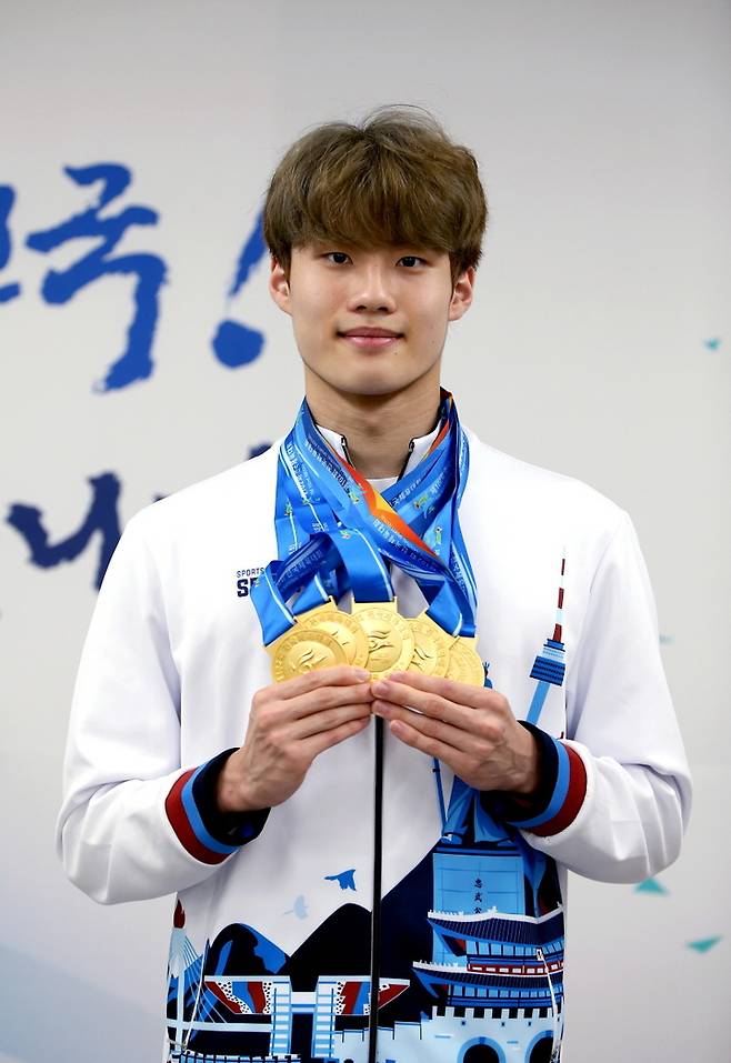 [서울=뉴시스] 배훈식 기자 = 제102회 전국체육대회가 폐막한 14일 오후 경북 구미시 구미시민운동장에서 열린 폐회식에 참석한 수영 황선우가 금메달을 목에 걸고 있다. (사진=대한체육회 제공) 2021.10.14. photo@newsis.com *재판매 및 DB 금지