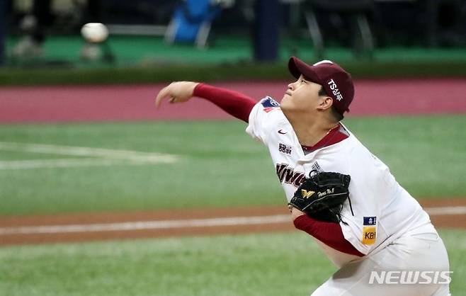 [서울=뉴시스] 김선웅 기자 = 14일 오후 서울 구로구 고척스카이돔에서 열린 2021 프로야구 NC 다이노스와 키움 히어로즈의 경기, 6회초 키움 교체투수 조상우가 역투하고 있다. 2021.10.14. mangusta@newsis.com