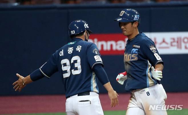 [서울=뉴시스] 김선웅 기자 = 14일 오후 서울 구로구 고척스카이돔에서 열린 2021 프로야구 NC 다이노스와 키움 히어로즈의 경기, 6회초 주자1루 상황 NC 김기환이 우익수 뒤 홈런을 날린 후 홈인하고 있다. 2021.10.14. mangusta@newsis.com