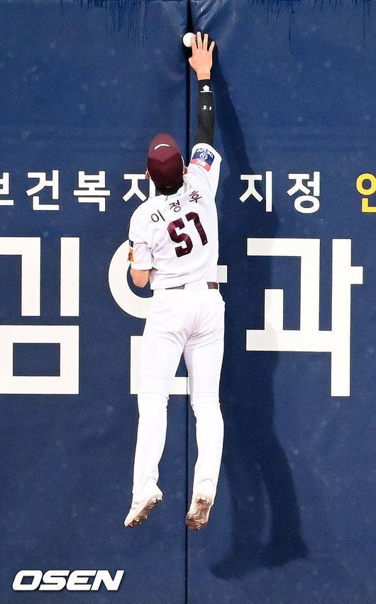 6회초 NC 선두타자 양의지의 좌중간 2루타때 담장에 박힌 볼을 키움 이정후가 빼고 있다. 21.10.14/rumi@osen.co.kr