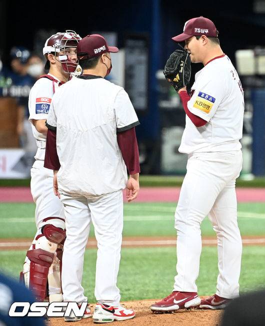 6회초 무사 주자 2루 NC 알테어의 좌익수 왼쪽 1타점 적시타를 허용한 키움 조상우가 송신영 코치와 얘기를 나누고 있다. 21.10.14/rumi@osen.co.kr