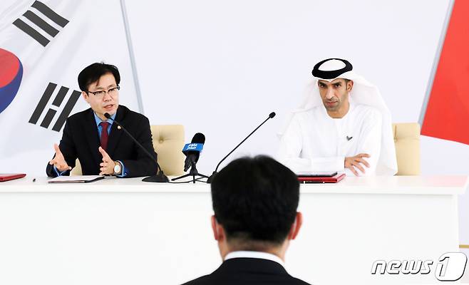(서울=뉴스1) = 여한구 산업통상자원부 통상교섭본부장이 14일 오전(현지시간) 아랍에미리트 두바이에서 타니 알 제유디(Thani bin Ahmed Al Zeyoudi) UAE 대외무역국무 장관과 한-UAE 포괄적경제동반자협정(CEPA) 추진합의 공동선언문을 발표하고 있다. (산업통상자원부 제공) 2021.10.14/뉴스1