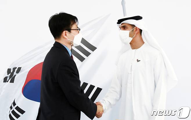 (서울=뉴스1) = 여한구 산업통상자원부 통상교섭본부장이 14일 오전(현지시간) 아랍에미리트 두바이에서 타니 알 제유디(Thani bin Ahmed Al Zeyoudi) UAE 대외무역국무 장관과 한-UAE 포괄적경제동반자협정(CEPA) 추진합의 공동선언문 발표를 위해 만나 악수를 나누고 있다. (산업통상자원부 제공) 2021.10.14/뉴스1