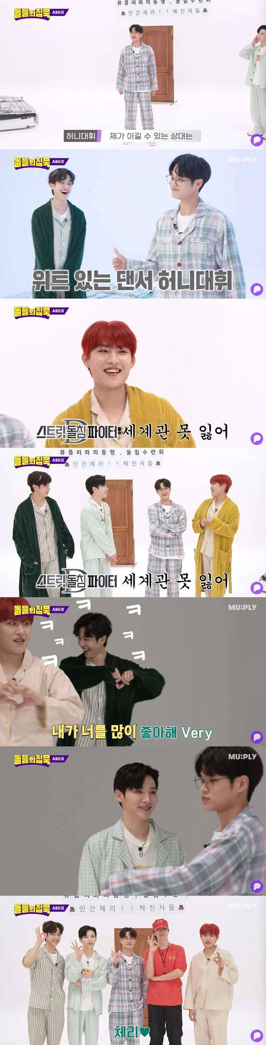 14일 오후 유튜브 채널 'MUPLY 뮤플리'에는 "'수련회 온 거 맞지...??' 인간체리 AB6IX 잠옷 댄스 배틀 1위는?!| 돌들의 침묵 | AB6IX (에이비식스) 'CHERRY'"라는 제목의 영상이 공개됐다.
