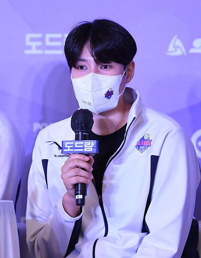 (서울=연합뉴스) IBK 기업은행 센터 김희진이 14일 서울시 강남구 청담 리베라 호텔에서 열린 프로배구 V리그 여자부 미디어데이에 참석해 질문에 답하고 있다. 2021.10.14 [한국배구연맹 제공. 재판매 및 DB금지]