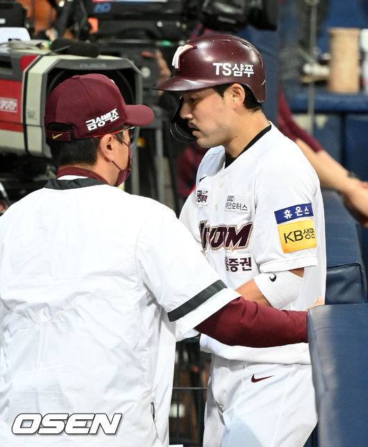 8회말 1사 주자 1,2루 키움 이정후의 우익수 앞 2타점 적시 3루타때 홈을 밟은 이용규가 덕아웃에서 홍원기 감독과 하이파이브를 하고 있다. 21.10.14/rumi@osen.co.kr