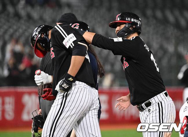 9회초 2사 1루에서 LG 이재원이 좌월 투런 홈런을 치고 김민성의 축하를 받고 있다. 2021.10.14 /sunday@osen.co.kr
