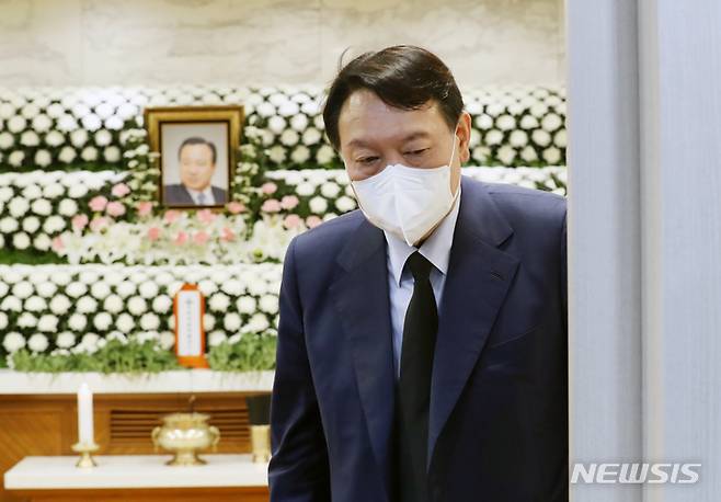 [서울=뉴시스] 백동현 기자 = 윤석열 전 검찰총장이 14일 오후 서울 서초구 가톨릭대학교 서울성모병원 장례식장에 마련된 고 이완구 전 국무총리의 빈소를 찾아 조문하고 있다. (공동취재사진) 2021.10.14. photo@newsis.com
