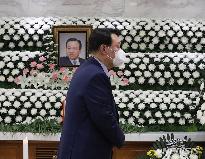 [서울=뉴시스] 백동현 기자 = 윤석열 전 검찰총장이 14일 오후 서울 서초구 가톨릭대학교 서울성모병원 장례식장에 마련된 고 이완구 전 국무총리의 빈소를 찾아 조문하고 있다. (공동취재사진) 2021.10.14. photo@newsis.com