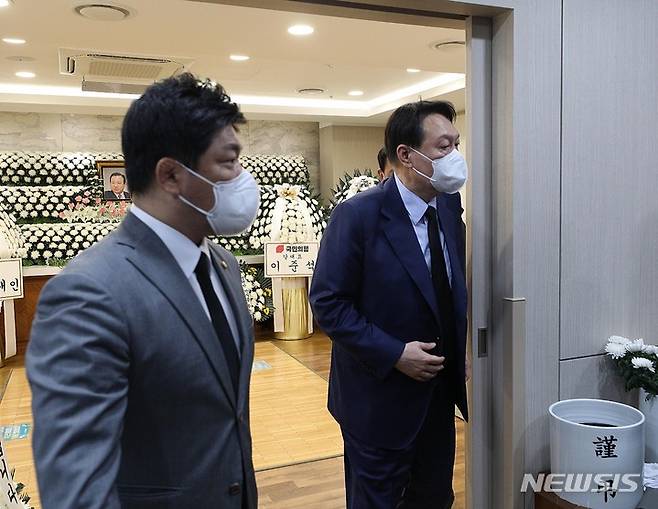 [서울=뉴시스] 백동현 기자 = 윤석열 전 검찰총장이 14일 오후 서울 서초구 가톨릭대학교 서울성모병원 장례식장에 마련된 고 이완구 전 국무총리의 빈소를 찾아 조문하고 있다. (공동취재사진) 2021.10.14. photo@newsis.com