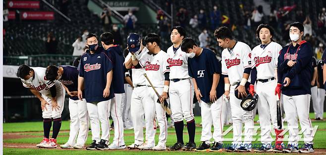 2021 KBO리그 롯데 자이언츠와 LG트윈스의 14일 부산사직야구장에서 열렸다. 롯데 선수들이 팀의 3대13 패배를 확정짓고 관중들에게 답례하고 있다. 부산=최문영 기자 deer@sportschosun.com /2021.10.14/