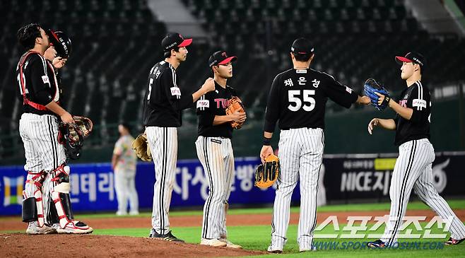 2021 KBO리그 롯데 자이언츠와 LG트윈스의 14일 부산사직야구장에서 열렸다. LG 마무리 채지선고 선수들이 팀의 13대3 대승을 거두고 하이파이브 하고 있다. 부산=최문영 기자 deer@sportschosun.com /2021.10.14/