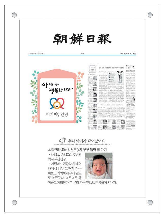 조선일보에 실린 당신 아기의 출생 소식, 본인이나 지인의 인터뷰·사진 기사를 영원히 추억으로 간직하세요. 조선일보는 독자가 원하는 신문 지면을 그대로 고급 액자에 담아 드리는 ‘조선일보 리프린트’ 서비스를 시작했습니다. 매주 ‘아이가 행복입니다’ 지면에 소개된 한 가족을 추첨해 리프린트를 선물로 드립니다. 8일 지면에 실린 김규리·김건우씨 부부의 딸 가린이<사진>가 이번 주 주인공입니다. 자세한 내용은 홈페이지(reprint.chosun.com)에서 확인할 수 있습니다.