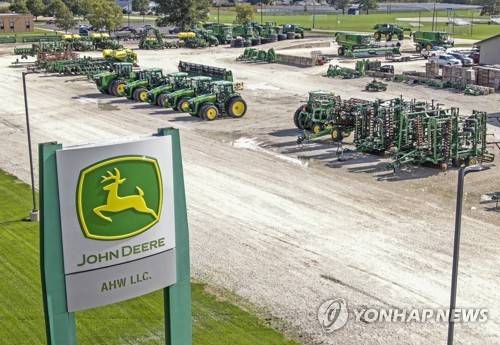 epa09524316 An aerial photo made with a drone shows tractors and farm implements for sale outside a John Deere dealership in Somonauk, Illinois, USA, 14 October 2021. Workers at John Deere numbering more than 10,000 walked off the job striking for the first time in more than 30 years after United Auto Workers union members rejected a five to six percent pay raise offer from the company. EPA/TANNEN MAURY