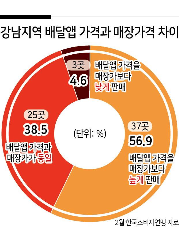 한국소비자연맹이 지난해 11월 서울 강남지역 배달앱 입점 업체 65곳을 직접 방문해 확인해 본 결과 절반이 조금 넘는 37곳(56.9%)이 매장에서 판매하는 가격보다 배달앱에 등록한 가격이 더 높은 것으로 나타났다.