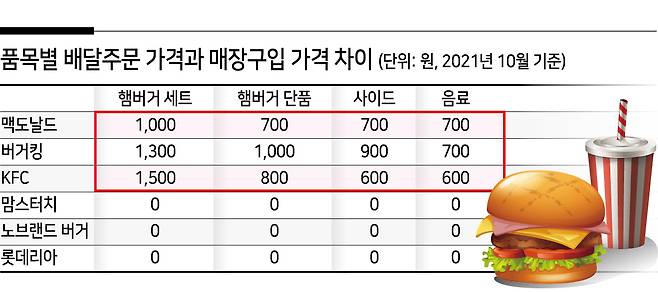 맥도날드는 햄버거세트를 주문했을 경우 배달 주문 가격과 매장가가 1000원 정도 차이난다. 햄버거 단품, 사이드와 음료는 각각 700원 정도 더 비쌌다. 버거킹은 햄버거세트를 주문할 경우 배달 가격은 매장가보다 1300원, 단품은 1000원, 사이드는 900원씩 더 비싸다. 지난 5월 한국소비자원 조사 때보다 세트 메뉴 기준 100원씩 더 올린 가격이다.