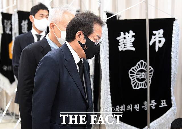국민의힘 대권 주자인 홍준표 의원이 15일 오전 서울 서초구 서울성모병원 장례식장에 마련된 고 이완구 전 국무총리의 빈소를 찾아 조문하고 있다.
