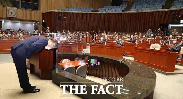 [더팩트ㅣ국회=이선화 기자] 더불어민주당 대선 후보인 이재명 경기지사가 15일 오전 서울 여의도 국회에서 열린 의원총회에 참석해 발언을 하고 있다.
