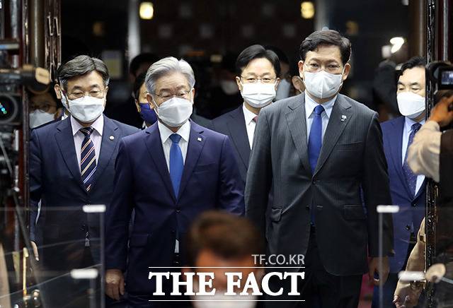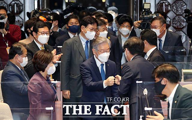 '대선 후보' 이재명, 민주당 의총 참석 "실천으로 갚을 것" [TF사진관]