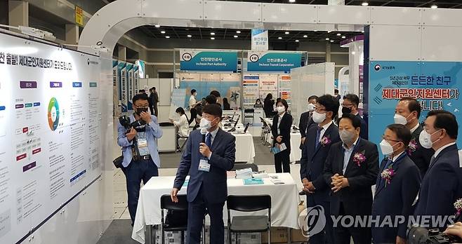 (서울=연합뉴스) 국가보훈처가 지난 14일 서울 양재동 AT센터에서 열린 '2021 대한민국 일자리 엑스포' 개막식 부스에 참여했다고 15일 밝혔다. 사진은 김용기 대통령직속일자리위원회 부위원장 등 주요 내빈에게 제대군인 일자리 정책에 관해 설명하는 보훈처 관계자. 2021.10.15