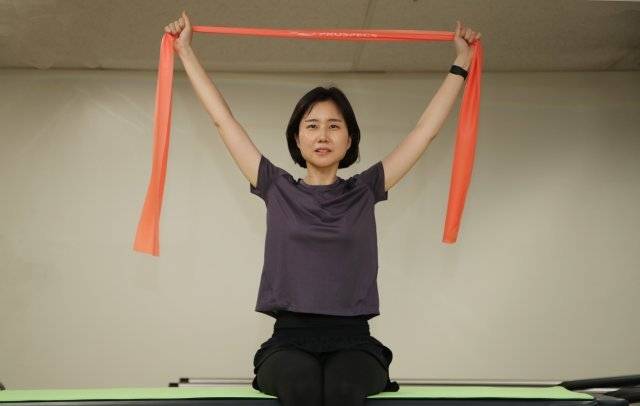 김 교수는 어깨 뭉침을 없애기 위해 평소에도 밴드를 이용해 스트레칭을 한다. 먼저 양팔로 밴드를 잡고, 정면을 향해 어깨 너비만큼 벌린다. 이어 천천히 앞에서 뒤로 180도 팔을 회전시킨 후 원위치로 돌아온다. 20~30회 반복한다(①).