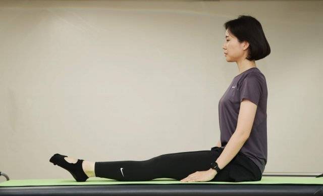 우선 종아리를 바닥에 댄 채 다리를 쭉 펴고 앉는다. 허리는 꼿꼿이 세운다. 이어 발이 바닥과 수직이 되도록 발뒤꿈치에 힘을 강하게 준다. 10초 동안 천천히 진행하되 발을 쭉 늘려주는 느낌이 되도록 한다(③).