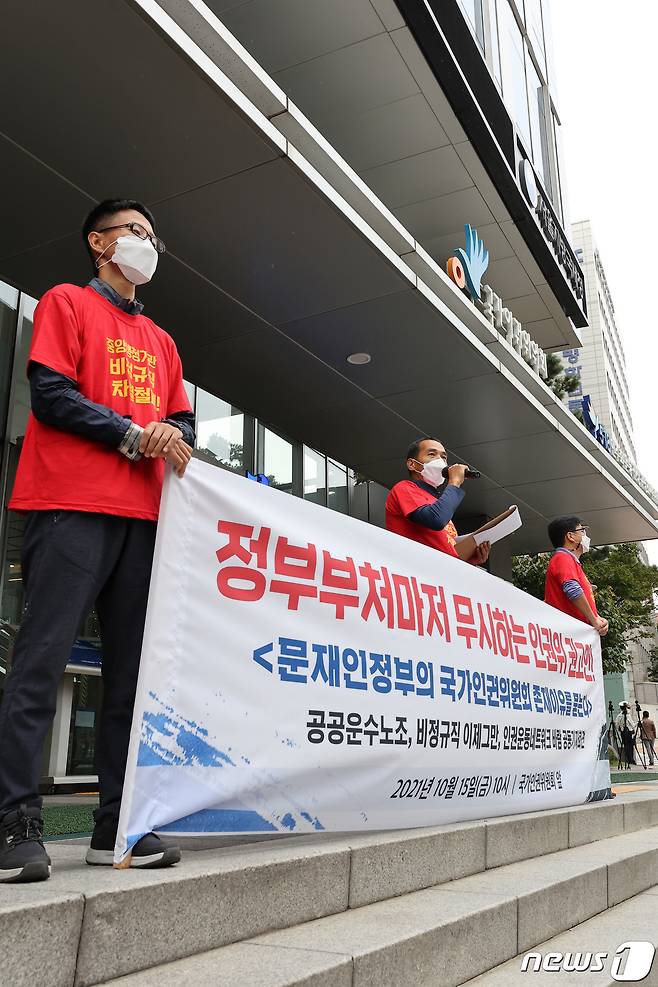 (서울=뉴스1) 조태형 기자 = 15일 오전 서울 중구 국가인권위원회 앞에서 민주노총 공공운수노조와 시민사회단체 회원들이 '정부의 국가인권위원회 존재이유를 묻는다' 공동 기자회견을 하고 있다. 2021.10.15/뉴스1