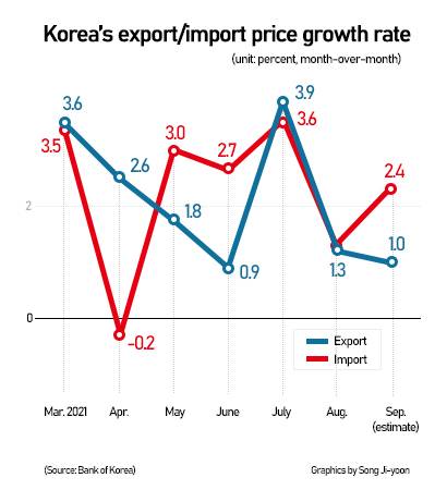 According to data released by the Bank of Korea on Thursday, the import price index grew 2.4 percent in September from the previous month to 124.58, the highest level since February 2014.
