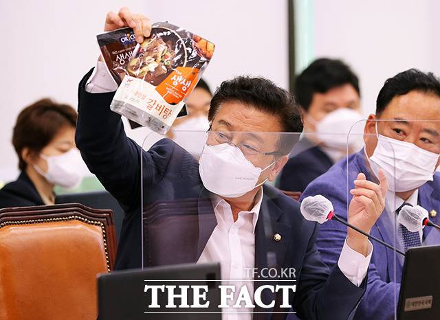 윤재갑 더불어민주당 의원이 15일 오전 서울 여의도 국회에서 열린 농림축산식품해양수산위원회의 농협중앙회, 농협경제지주, 농협금융지주, 농협은행 등에 대한 국정감사에서 젖소 고기로 만들어진 갈비탕을 들어 보이고 있다.