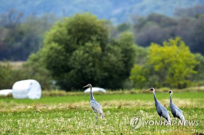 (철원=연합뉴스) 15일 강원 철원군 민통선 마을 내 빈 들에서 재두루미(천연기념물 제203호, 멸종위기Ⅱ급) 가족이 쉬고 있다. 2021.10.15 [권영덕 작가 제공. 재판매 및 DB 금지]