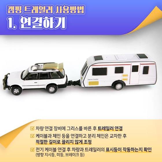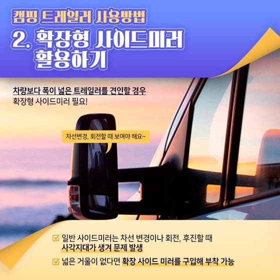 ◆ 캠핑카 운전을 위해 필요한 면허는? - 일반승합차 등을 개조한 캠핑카는 2종 보통면허로 운전 가능! - 트레일러를 연결하고 운전해야 한다면, 소형견인차 면허 필요! ◆ 캠핑 트레일러 사용방법 1. 연결하기 - 차량 연결 장비에 그리스를 바른 후 트레일러 연결 - 케이블과 체인 등을 연결하고 분리 체인은 교차한 후 적절한 길이로 끌리지 않게 조정 - 전기 케이블 연결 후 차량과 트레일러의 표시등이 작동하는지 확인(방향 지시등, 미등, 브레이크 등) 2. 확장형 사이드미러 활용하기 차량보다 폭이 넓은 트레일러를 견인할 경우 확장형 사이드미러 필요! 차선변경, 회전할 때 보여야 해요.