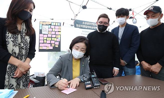 (서울=연합뉴스) 전수영 기자 = 정의당 심상정 대선후보가 15일 오후 서울 종로구 세종로공원 전국자영업자비상대책위 농성장을 방문, 방명록을 작성하고 있다. 조지현 전국자영업자비상대책위원회 공동대표(왼쪽부터), 심상정 후보, 김기홍 전국자영업자비상대책위원회 공동대표, 이창호 전국자영업자비상대책위원회 공동대표, 정인성 대한당구장협회 전무. 2021.10.15 [국회사진기자단]