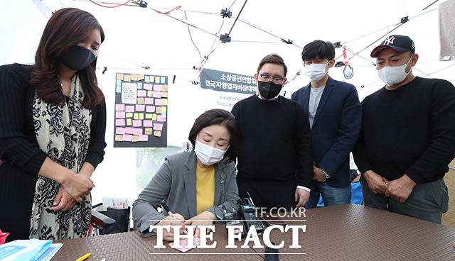 이날 심 의원은 농성장을 찾아 코로나19로 지친 자영업자들을 위로했다.