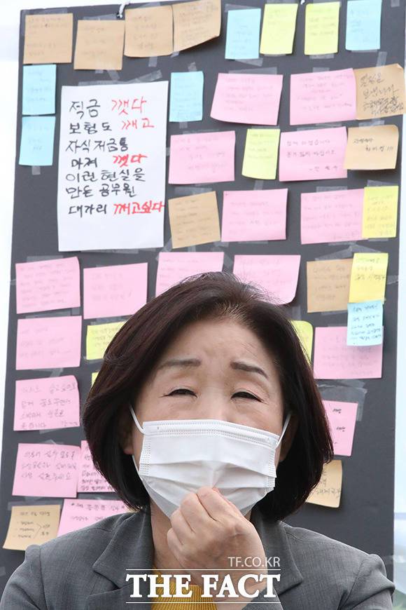이날 심 의원은 농성장을 찾아 코로나19로 지친 자영업자들을 위로했다. 심 의원은 포스트잇에 '자영업자들이 애국자입니다. 정당한 손실 보상제도 반드시 이뤄내겠습니다. 정의당 대통령 후보'라는 메시지를 남기며 의지를 밝혔다.