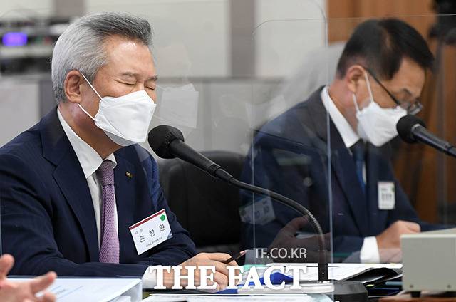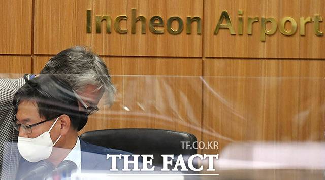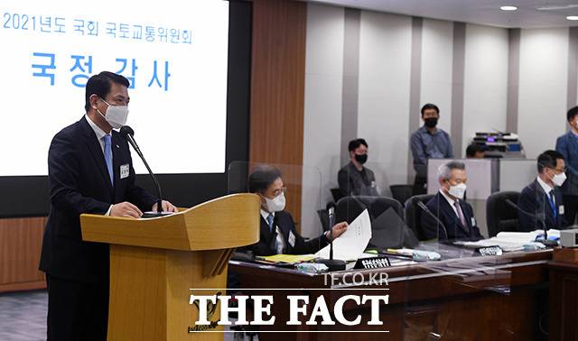 [더팩트ㅣ국회사진취재단] 손창완 한국공항공사 사장이 15일 오전 인천 영종도 인천국제공항공사에서 열린 국회 국토교통위원회의 인천국제공항공사·한국공항공사 국정감사에서 업무보고를 하고 있다.